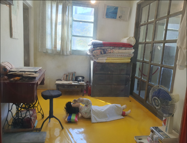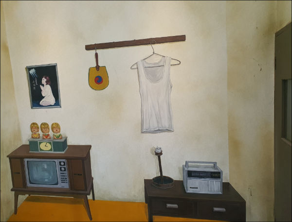 세 번째 방엔 아이가 방바닥에 드러누워 장난치는 모습이 전시되어 있었습니다. 그 옆에는 재봉틀, 선풍기, 책 몇 권, 그리고 다다미처럼 차곡차곡 쌓아둔 이불이 있었지요. 여름방학 때, 선풍기 앞에서 아이스크림을 먹으며 뒹굴던 추억이 떠오르기도 했습니다.